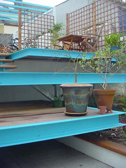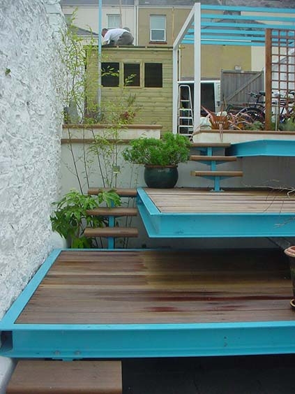 Inspired by the diving boards on Plymouth Hoe, I created three decks that appear to cantilever each linked by a small flight of hardwood steps.Hardwood decking combined with blue powder coated steel creates a fun seaside feel.